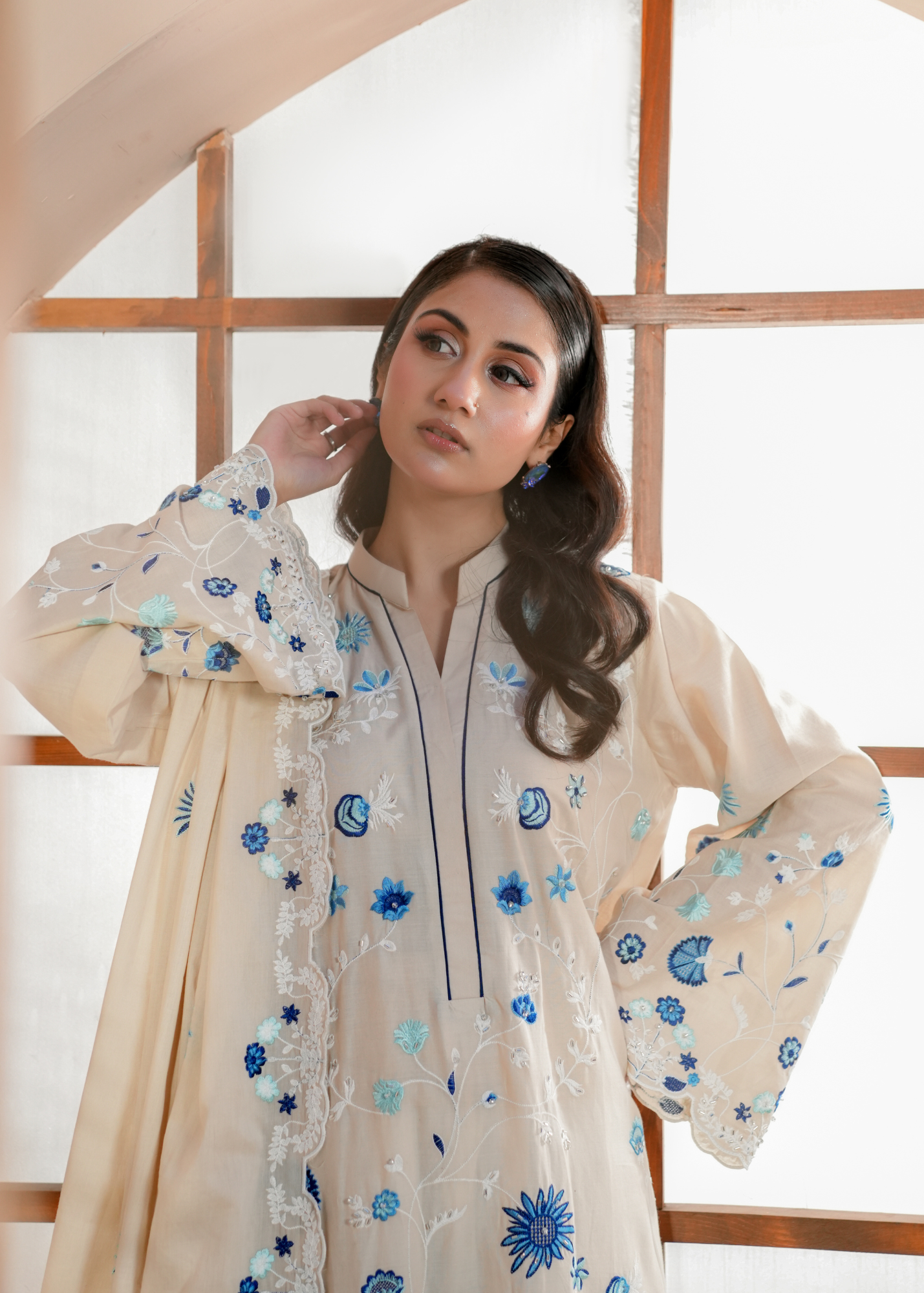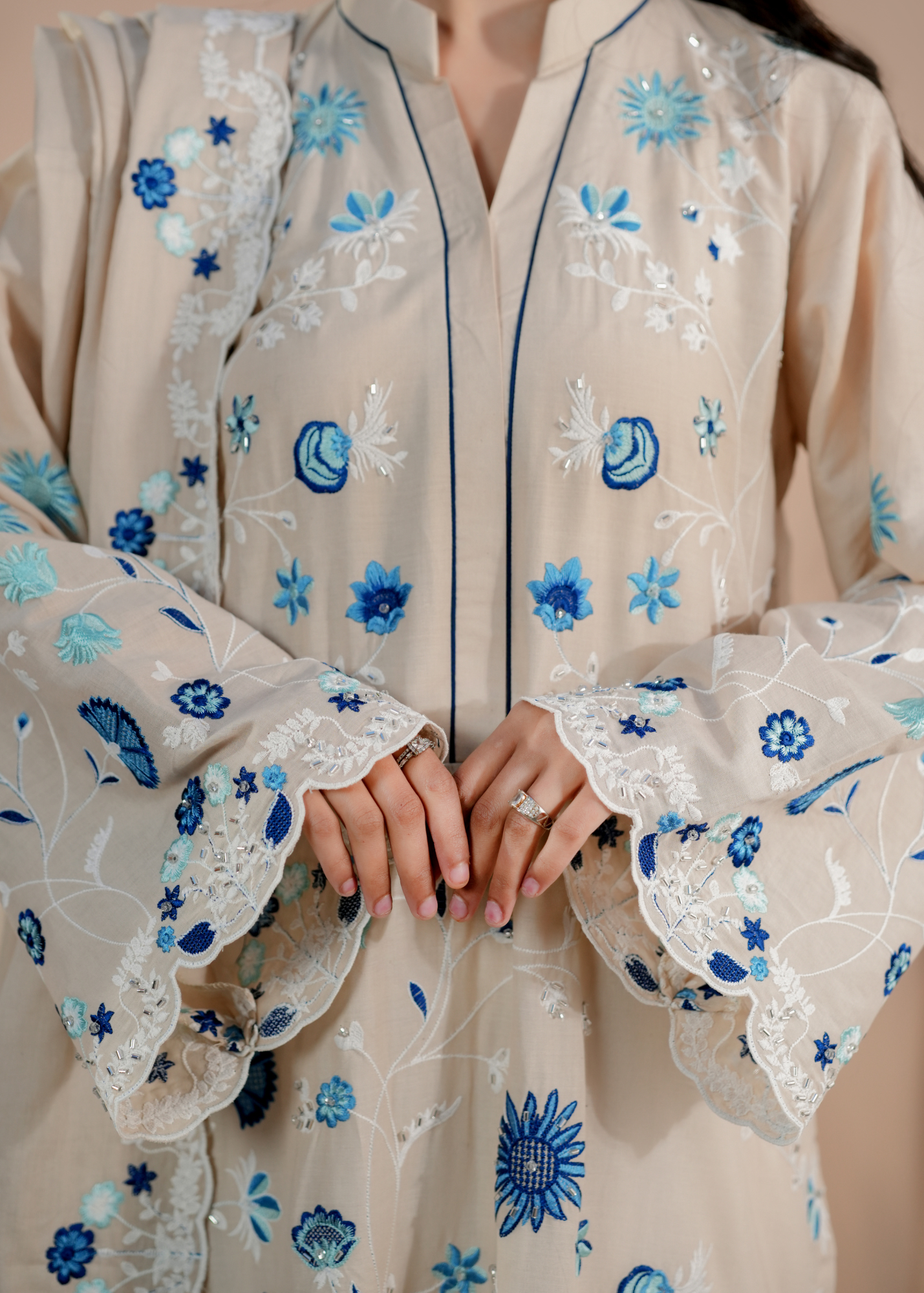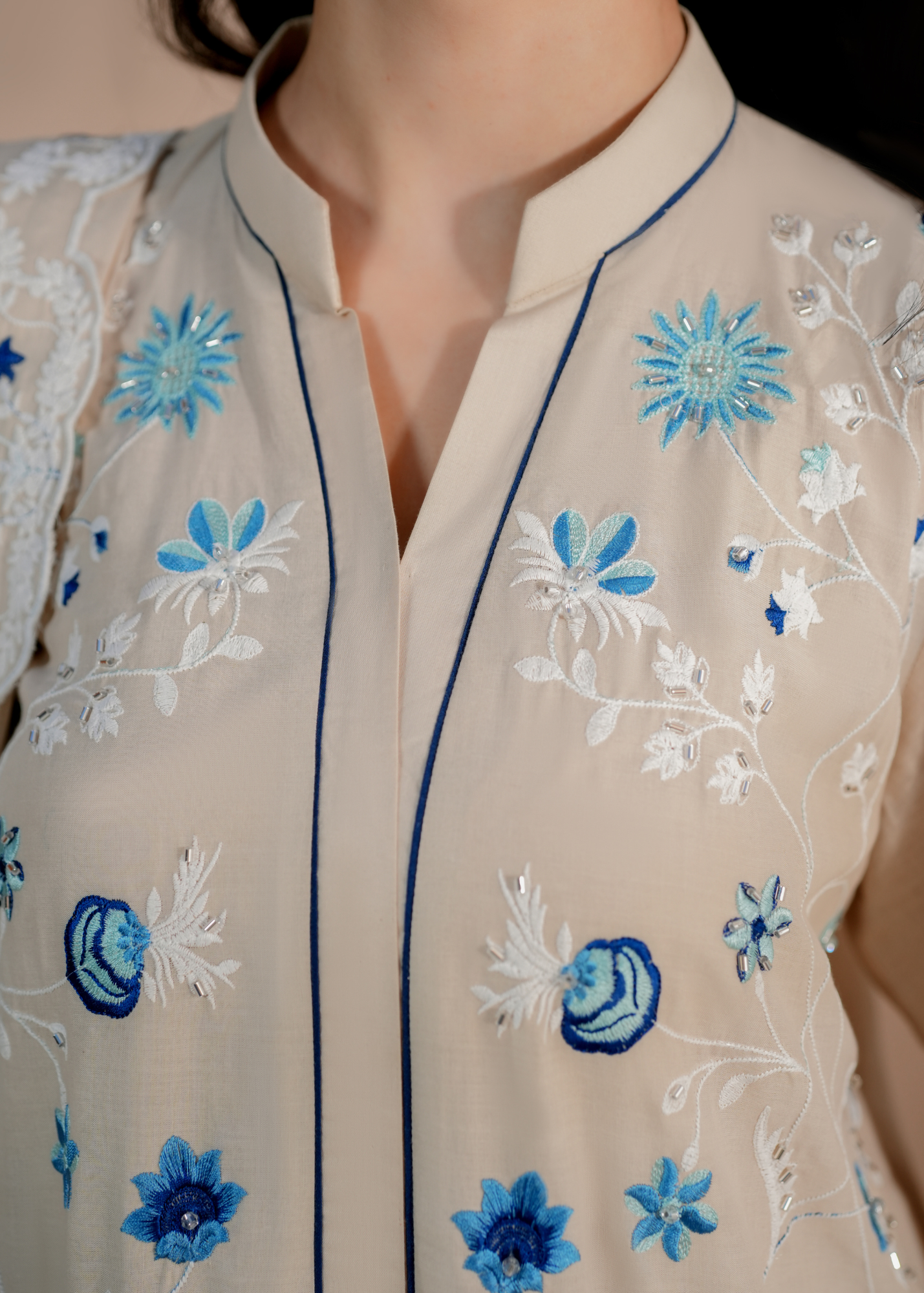 The kurti is beautifully hand embroidered by skilled artisans, giving each piece a refined and exclusive finish. The delicate hand stitch work adds depth and grace without overpowering the outfit, making it perfect for festive gatherings, formal dinners, and special occasions.